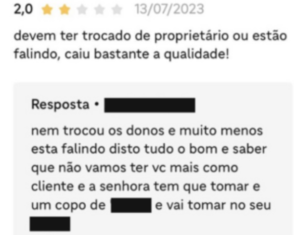 Em algumas dessas interações, sobraram xingamentos e grosserias. “Fala nos comentários o que não sabe e ainda fica mentindo [...], sua cliente mentirosa”, disse o estabelecimento após uma mulher relatar que recebeu um pedido diferente do solicitado.
